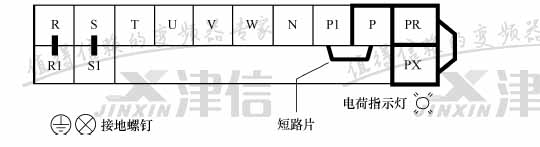 其中端子排上的R、S、T 端子與三相工頻電源連接, U、V、W 端子與電動(dòng)機(jī)連接; P1、P 端子, PR、PX 端子, R、R1 端子和S、S1 端子用短接片連接; 接地端子用螺釘與接地線連接固定。