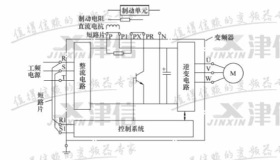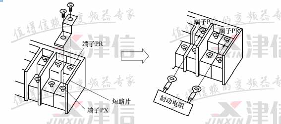 2、PX、PR 端子外接短路片, 將內(nèi)部制動(dòng)電阻和制動(dòng)控制器件連接起來(lái)。有時(shí),變頻器在高頻度制動(dòng)內(nèi)置制動(dòng)電阻時(shí)易發(fā)熱, 由于封閉散熱能力不足, 這時(shí)需要安裝外接制動(dòng)電阻來(lái)替代內(nèi)置制動(dòng)電阻。 可將PX、PR 端子之間的短路片取下, 再在P、PR 端外接制動(dòng)電阻。