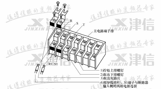 4、R1、S1 端子內(nèi)接控制電路, 外部通過(guò)短路片與R、S 端子連接, R、S 端的電源通過(guò)短路片由R1、S1 端子提供給控制電路作為電源。如果希望R、S、T 端無(wú)工頻電源輸入時(shí)控制電路也能工作, 可以取下R、R1 和S、S1 之間的短路片, 將兩相工頻電源直接接R1、S1 端。